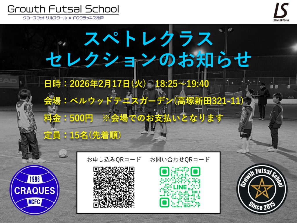 グロースフットサルスクールでは、2/17(日)に選抜クラス(スペトレ)のセレクションを実施いたします。 よりハイレベルな内容とメンバーでトレーニングするため、ジュニアユース合格に向けて取り組みたい選手に最適なクラスです。 コーチングスタッフは、JFAのA級またはB級以上を保有するコーチが担当いたします。